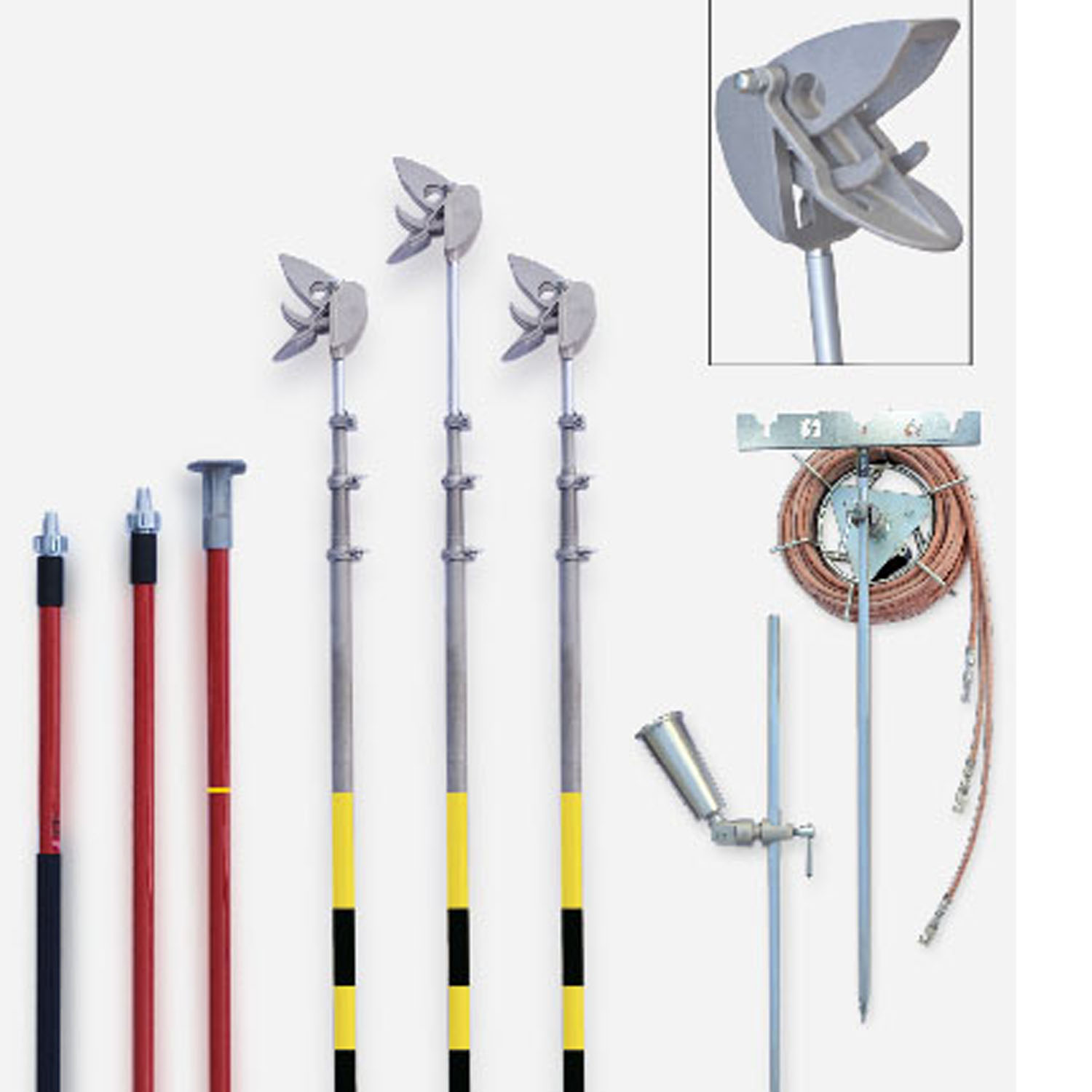 - 3 telescopic metal poles composed of 3 parts with self-locking fixed contact clamp for conductors with diameter between 3 and 22 mm.